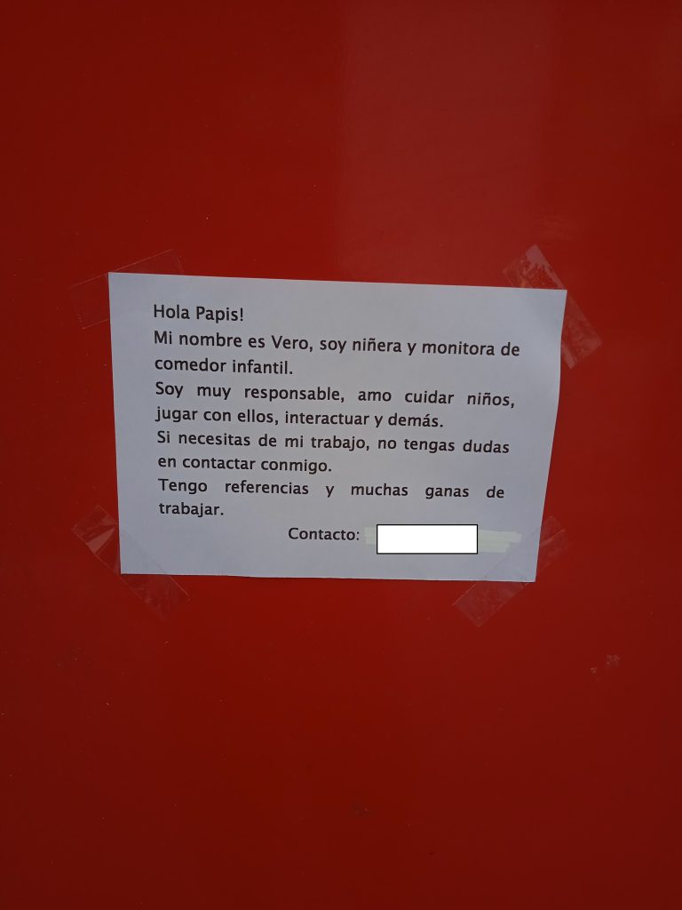 El otro día vi este cartel pegado con celo en una marquesina. Una niñera ofreciendo sus servicios. Simple, directo… y con algo que me llamó la atención al instante: